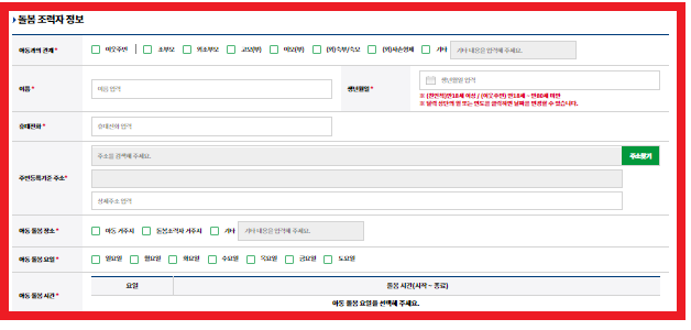 🎫 성명, 생년월일, 휴대전화, 주민등록등본 기준 주소, 아동과의 관계, 양육공백유형(맞벌이, 한부모가정, 장애부모가정, 다태아가정, 다문화가정, 아동학대위기아동, 장기부재, 장기입원, 학교재학, 취업준비, 모 출산, 기타 등등)을 선택합니다.