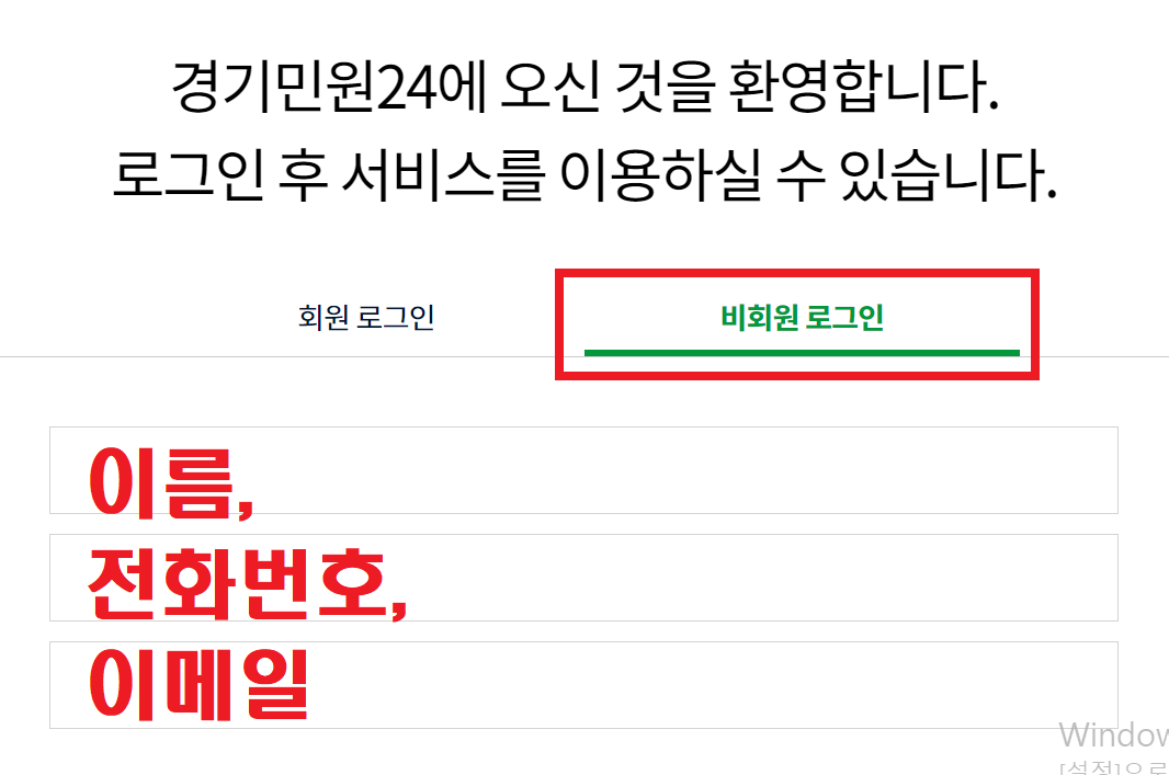 1. 양육자(부모님)은 경기도 민원 24에 접속하여 비회원 로그인합니다.