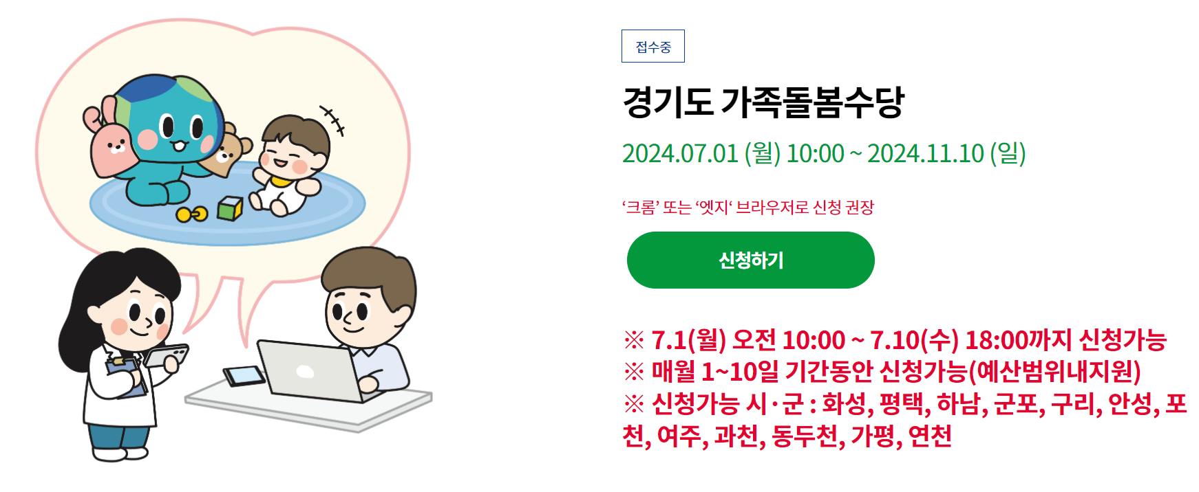 - 2024년 7월 1일~2024년 11월 10일간 신청 (월 40시간 이상 돌봄시 신청월의 다음달에 계좌로 지급)