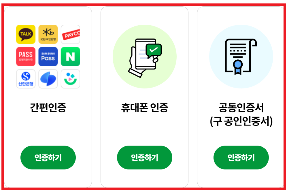 2. 간편인증, 휴대폰인증, 공동인증서 방법으로 인증을 합니다.